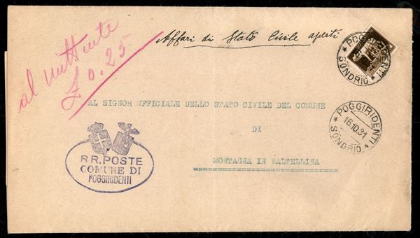 Involucro di lettera affrancata con 5 cent Imperiale (243) isolato da Poggiridenti a Montagna in Valtellina del 16.10.31 - ex coll. Provera