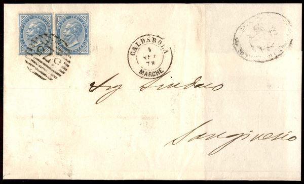 Involucro di lettera affrancata con coppia orizzontale del 10 cent V. Emanuele II azzurro chiaro (27b) da Caldarola per San Ginesio del 4. set. 78 - ex coll. Provera