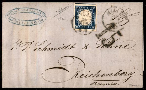 Lettera affrancata con 20 cent cobalto oltremare scuro (15Di) da Milano per Reichenberg (Boemia) del 20. apr. 1861 - tassata - cert. Sorani