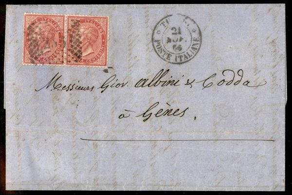 Lettera affrancata con coppia del 40 cent V. Emanuele II (20 Regno) da Tunisi a Genova del 21 nov. 66