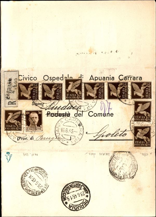 Lettera raccomandata affrancata con nove 50 cent Imperiale Aerea (A11 - Regno) + 30 cent Imperiale (249 - Regno) da Carrara a Spoleto del 16.6.45 - ex coll. Provera