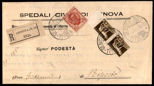 Lettera raccomandata con ricevuta di ritorno - affrancatura mista con 75 cent Floreale (201) + coppia del 5 cent Imperiale (243) - da Genova per Riposto del 6.12.30 - ex coll. Provera