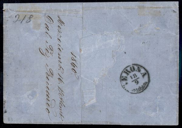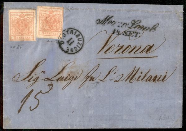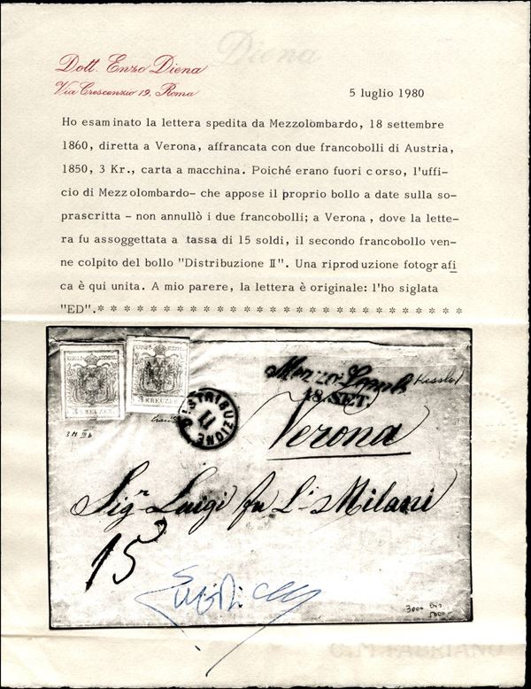 Mezzo Lombardo - 3 kreuzer (3M IIIb) sfuggito all'annullo + Distribuzione II (non catalogato su Austria) su 3 kreuzer (3 - piegato in alto) usati a validità scaduta su lettera per Verona del 18.9.60 - 15 di tassa - raro insieme - cert. Diena