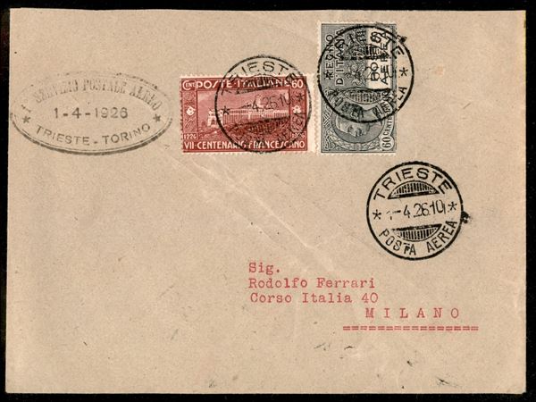 Primo Volo Trieste Pavia (Longhi 1455) - busta da Trieste a Milano del 1.4.26