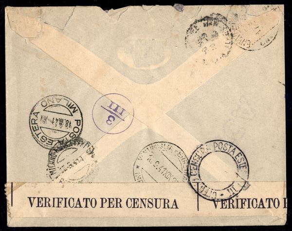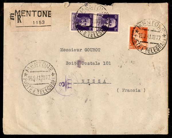 Raccomandata da Mentone a Nizza del 16.9.41 affrancata con coppia del 50 cent + un 1,75 lire Imperiale (251 + 254)