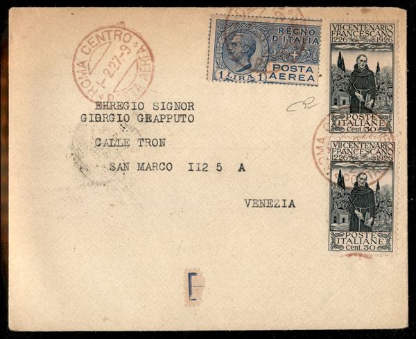 Roma Venezia (Longhi 1688) - busta affrancata con valori di Regno (193 due + 4) del volo inaugurale