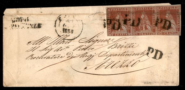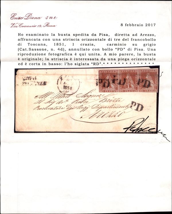 Striscia orizzontale di tre del 1 crazia carminio su grigio (14d) annullato con PD su bustina da Pisa a Arezzo - difetti - cert. Diena