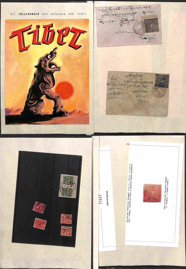 TIBET - Collezione specializzata dei Falsi delle emissioni montata su 33 fogli d'album - 126 valori (singoli/coppie/blocchi) nuovi e usati + 11 lettere con diverse affrancature - insieme molto interessante per collezionista avanzato - ex Coll. Hellrigl