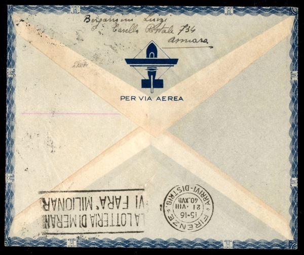 1 lira Posta Aerea Triennale d'Oltremare (17) + complementare (200) su aerogramma da Asmara a Firenze del 16.8.40
