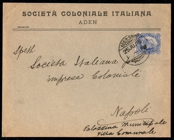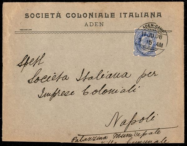 1908 - Due frontespizi di lettera della corrispondenza della Società Italiana per Imprese Coloniali - Aden Camp 11 ve 25 luglio 1908