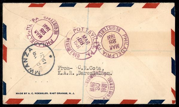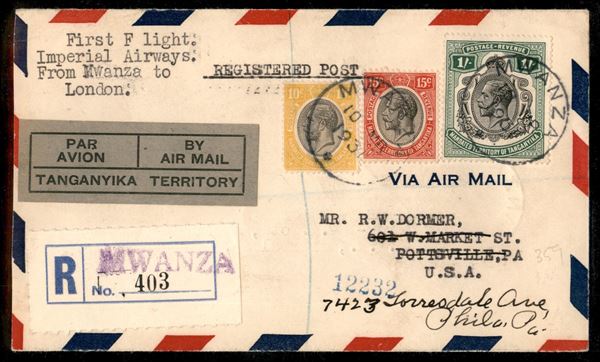 1931 - Imperial Airways - Primo Volo Mwanza Londra 10.3.31 - aerogramma raccomandato per Pottsville (USA) poi rispedito a Philadelphia - non comune destinazione per il dispaccio