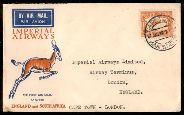 1932 - Imperial Airways - Primo Volo regolare Cape Town Londra 27.1.32 - corriere dal Sud Africa - aerogramma su busta speciale Springbok - dispaccio composto da 10 lettere