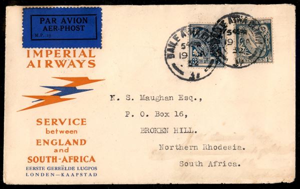 1932 - Imperial Airways - Primo Volo regolare Londra Cape Town 20.1.32 - corriere dall'Irlanda - aerogramma su busta speciale da Baile Atha Cliath del 19.3.32 a Broken Hill (Nord Rodesia) - dispaccio composto da 12 lettere