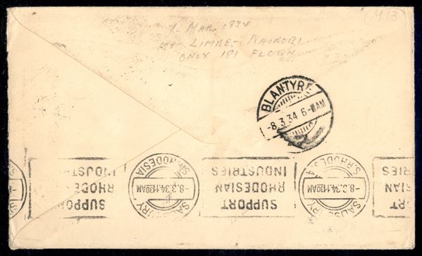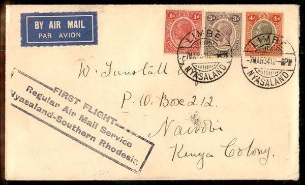 1934 - Imperial Airways - Primo Volo Nyasaland Southern Rhodesia 7.3.34 - aerogramma da Limbe a Nairobi - cachet "Firt Flight/Regular Air Mail Service/Nyasaland - Southern Rhodesia"