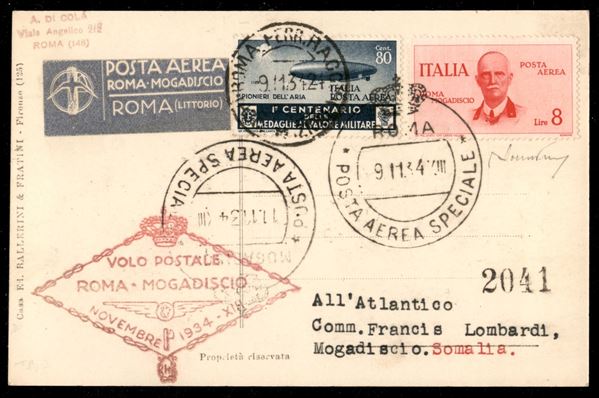 1934 - Volo Roma Mogadiscio - Roma Mogadiscio 11.11.34 (Longhi 3195) cartolina illustrata affrancata con 8 lire serie speciale (87) + complementare (77) in tariffa - cachet speciale del volo