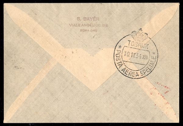 1934 - Volo Roma Mogadiscio - Roma Tobruk 9.11.34 (Longhi 3187) aerogramma affrancato con il 2 lire della serie speciale + complementari (84 + 368 + due 74) e annullati con il cachet speciale del volo