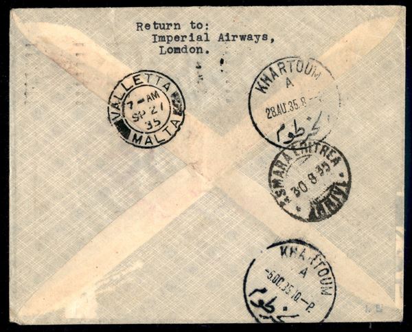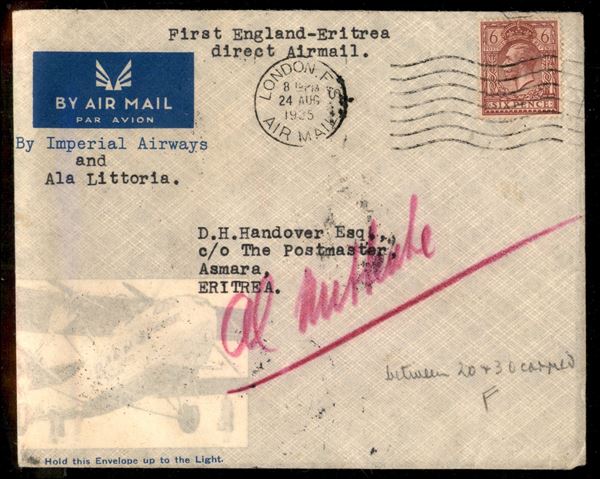 1935 - Primo Volo Londra Asmara del 24.8.35 (Longhi 3310) operato da Imperial Airways e Ala Littoria - pochissimi aerogrammi trasportati