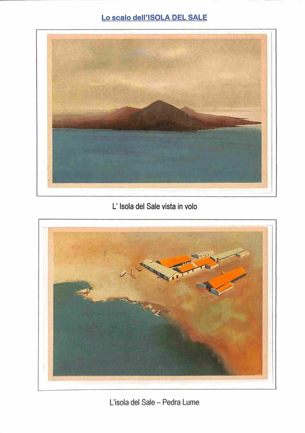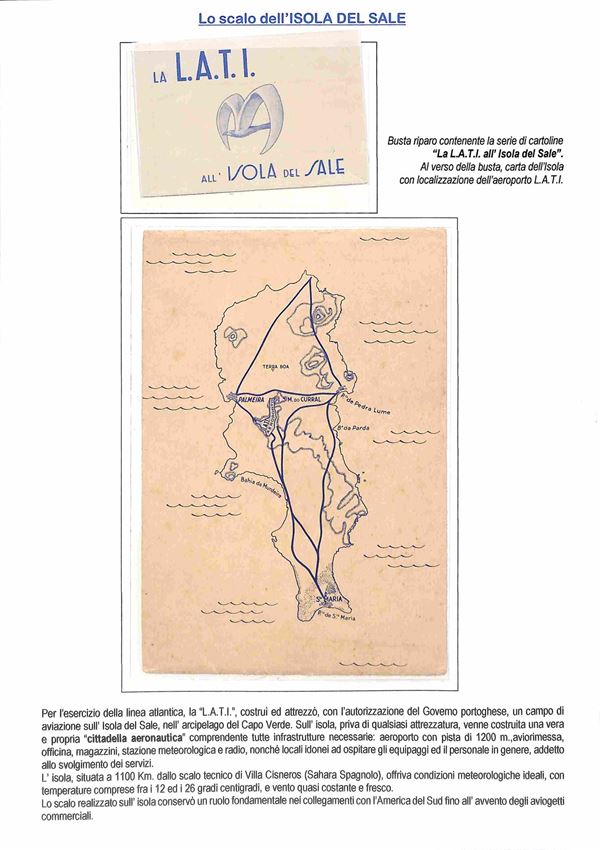 1939 - L.A.T.I. - Busta riparo "La Lati all'Isola del Sale" (Longhi 3955a) con la serie completa delle 4 cartoline dello scalo (Longhi 3956/3959) - insieme montato su 3 fogli A4 con didascalie - molto bello