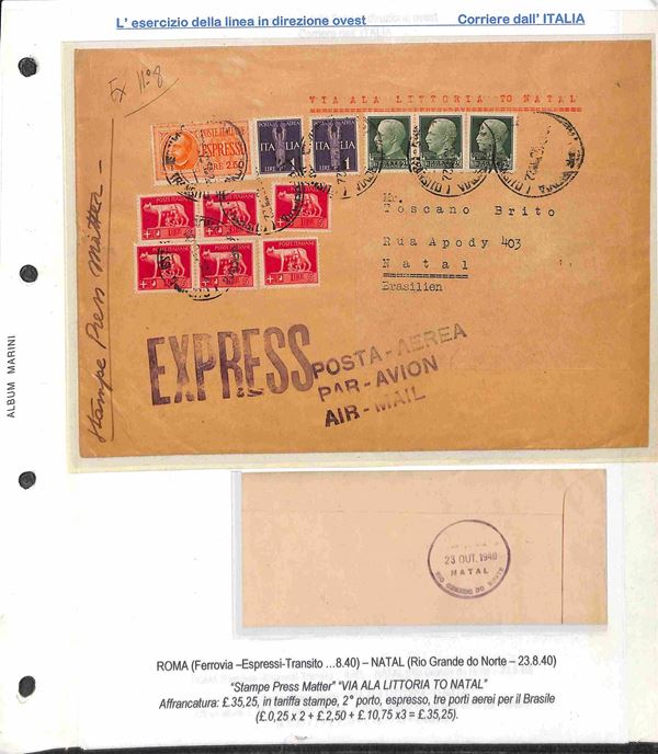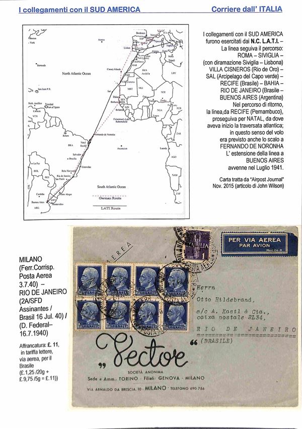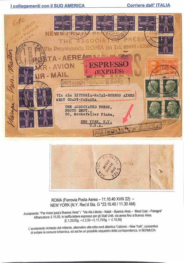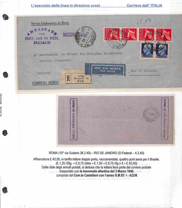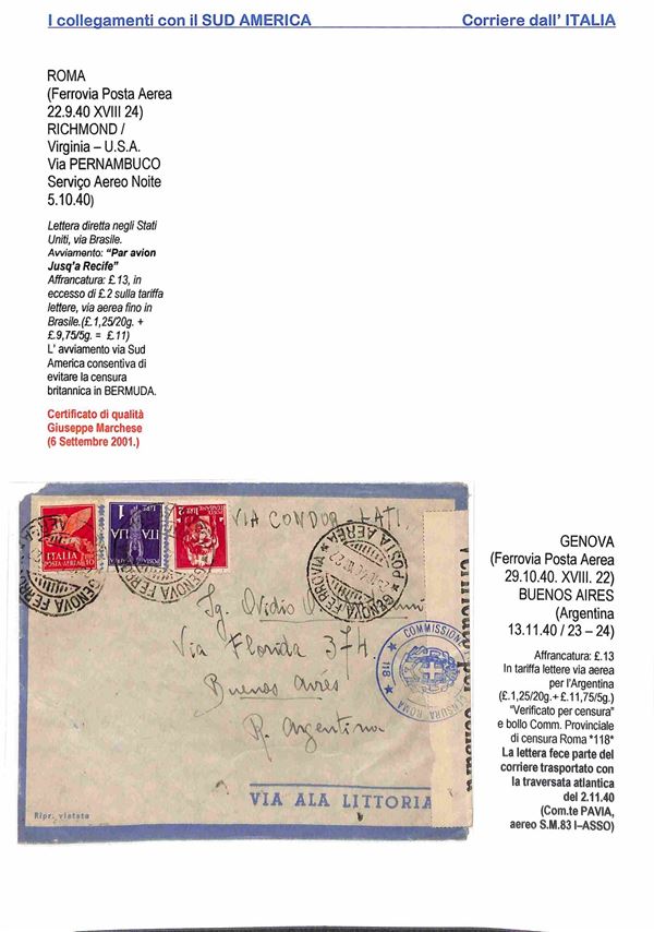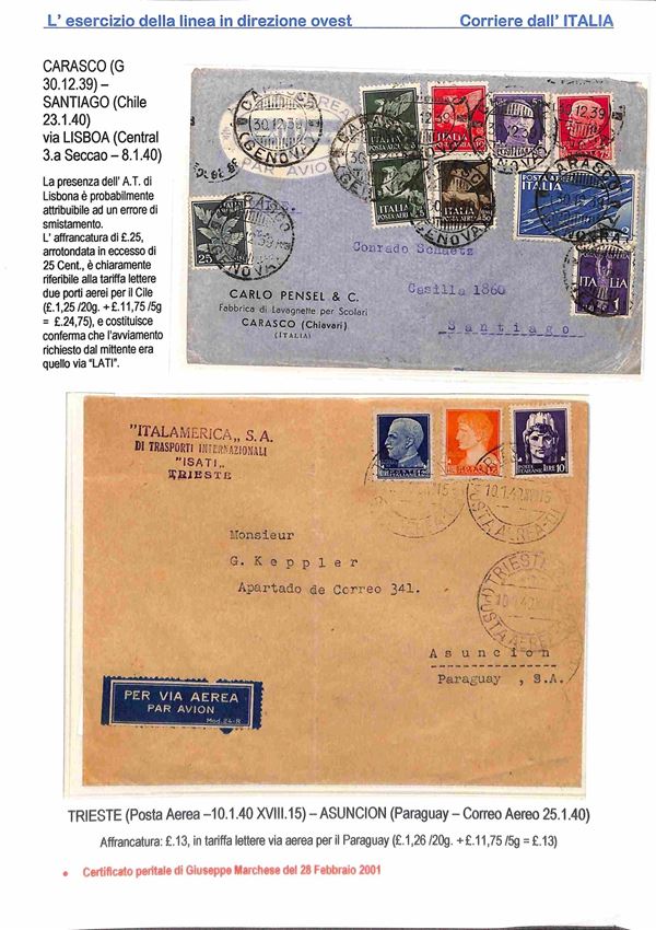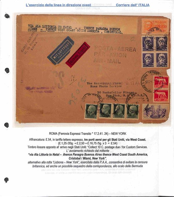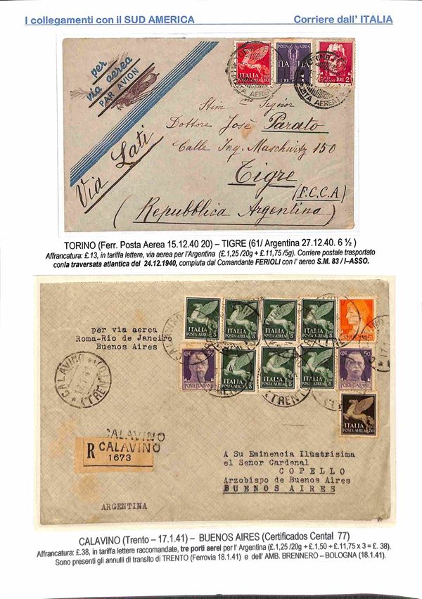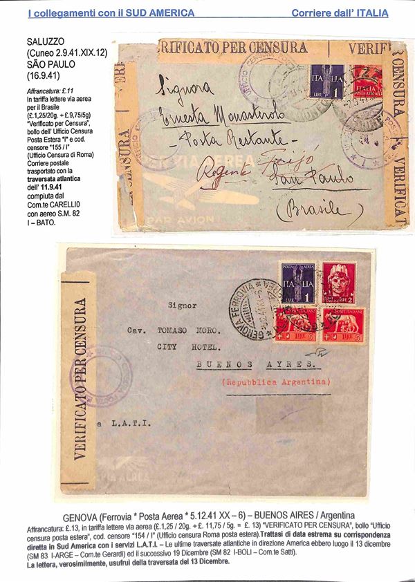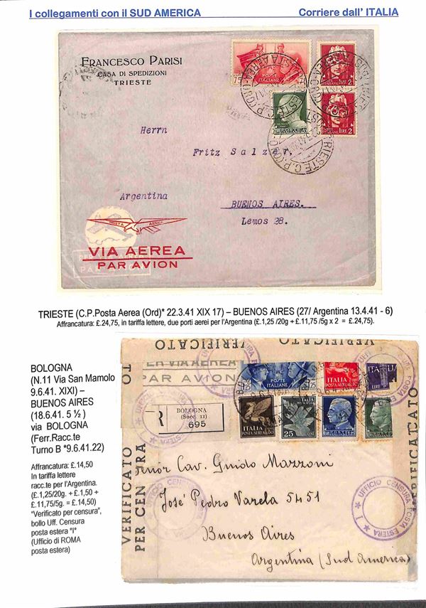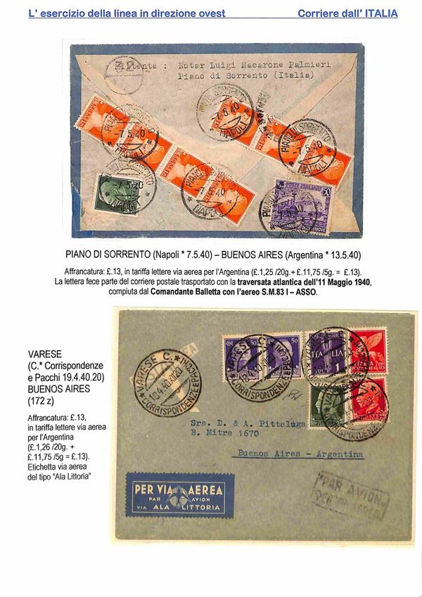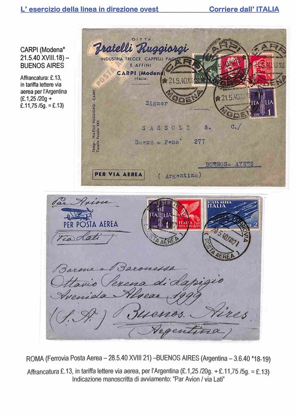 1939/1941 - Insieme di 20 aerogrammi L.A.T.I. dell'esercizio della linea Italia America - 11 buste per Buenos Aires 1 per San Paolo 2 per Rio de Janeiro 1 per Santiago 1 per Asuncion 1 per Tigre 1 per Natal e 1 per New York - tutte con affrancature differenti in tariffa - montate su fogli A4 con didascalie