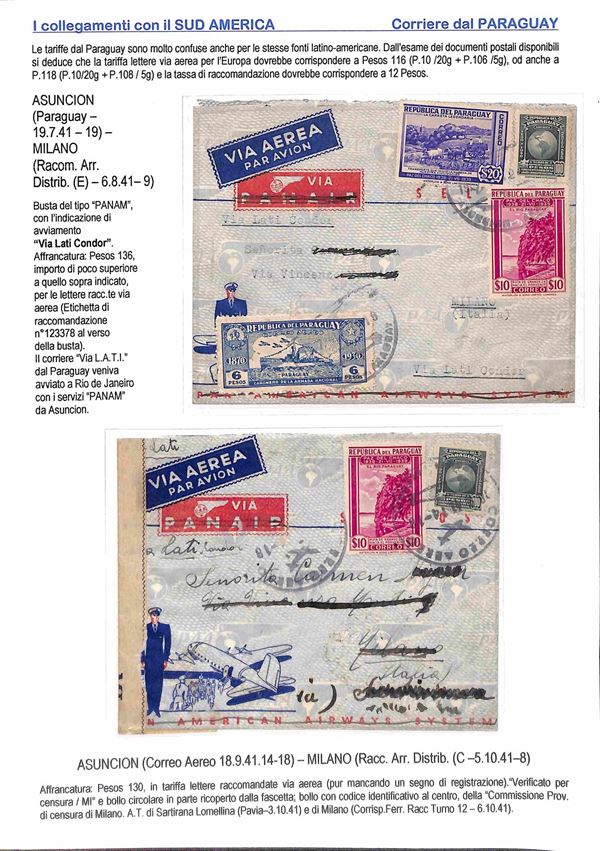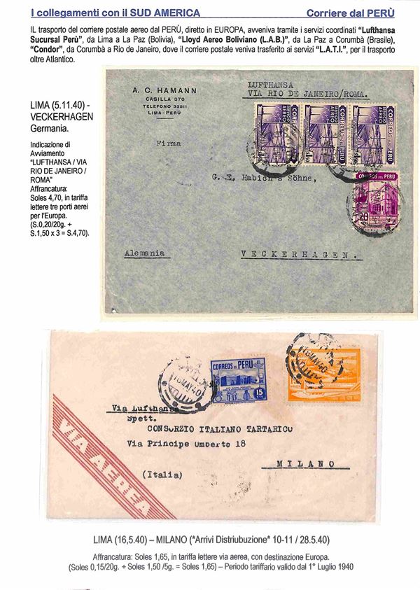1940/1941 - Due aerogrammi dal Paraguay via Lati Condor e due aerogrammi da Lima via Lati con destinazione Italia e Germania montati su 2 fogli A4 con didascalie