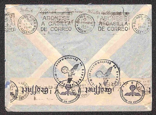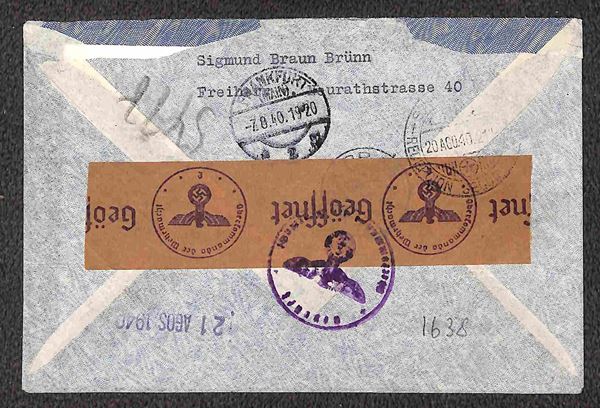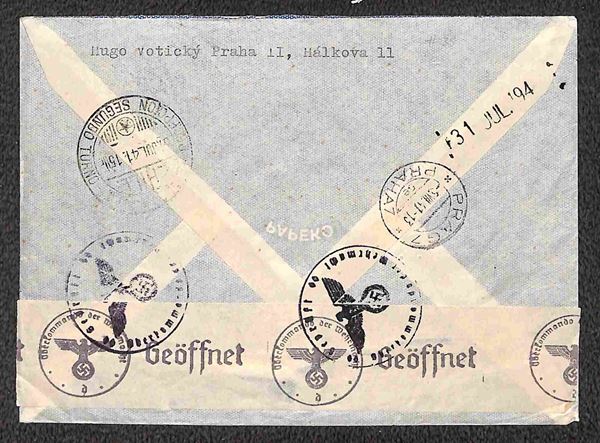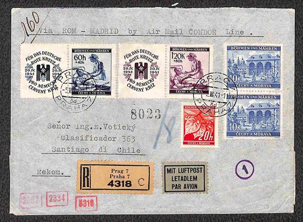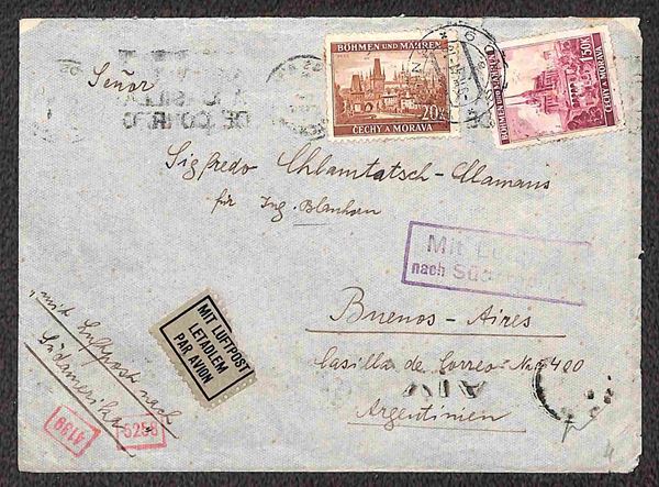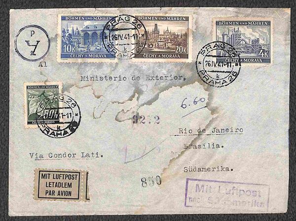1940/1941 - Esercizio della linea Italia America - quattro aerogrammi dalla Cecoslovacchia rispettivamente da Brno per Santiago del 5.8.40 e per Buenos Aires del 9.4.41 e da Praga per Rio de Janeiro del 26.4.41 e per Santiago del 5.7.41