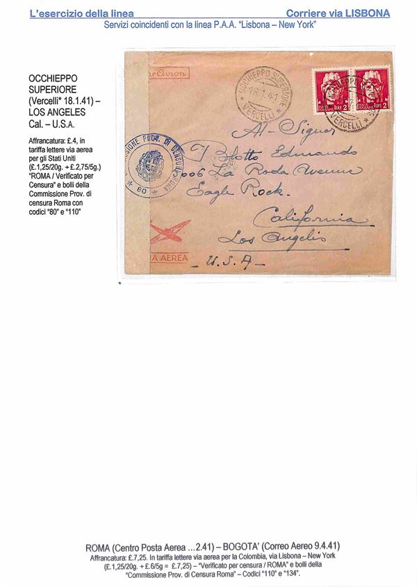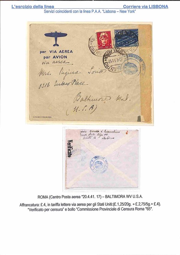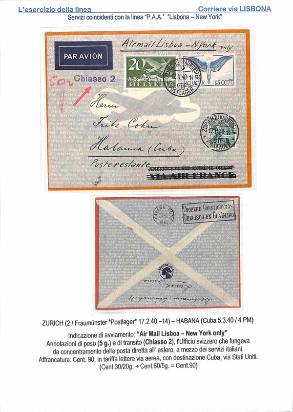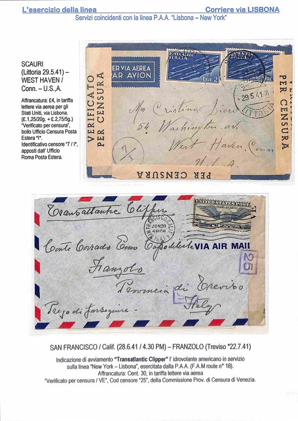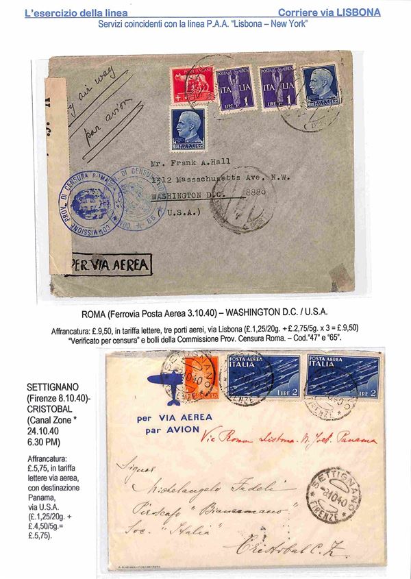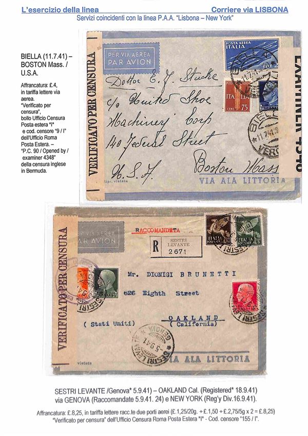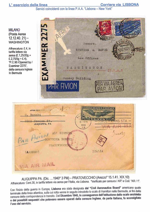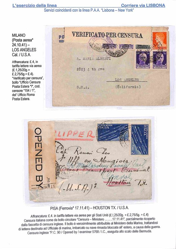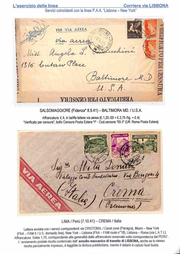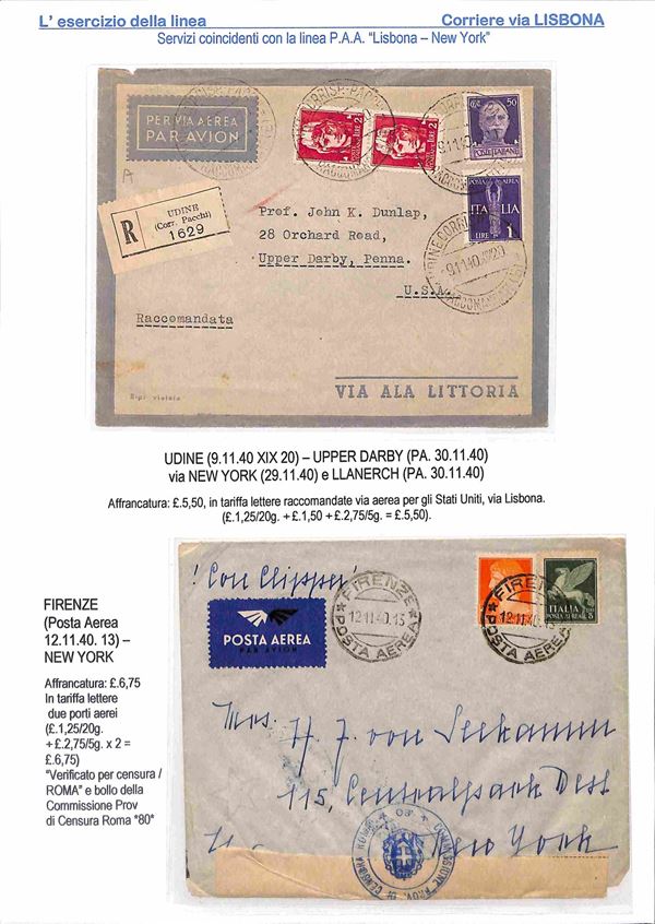 1940/1941 - Esercizio della linea Italia America - Insieme di 17 aerogrammi via Lisbona - 13 buste dall'Italia 2 buste dagli Stati Uniti 1 dalla Svizzera e 1 dal Perù - tutte con affrancature diverse montate su 10 fogli A4 con didascalie
