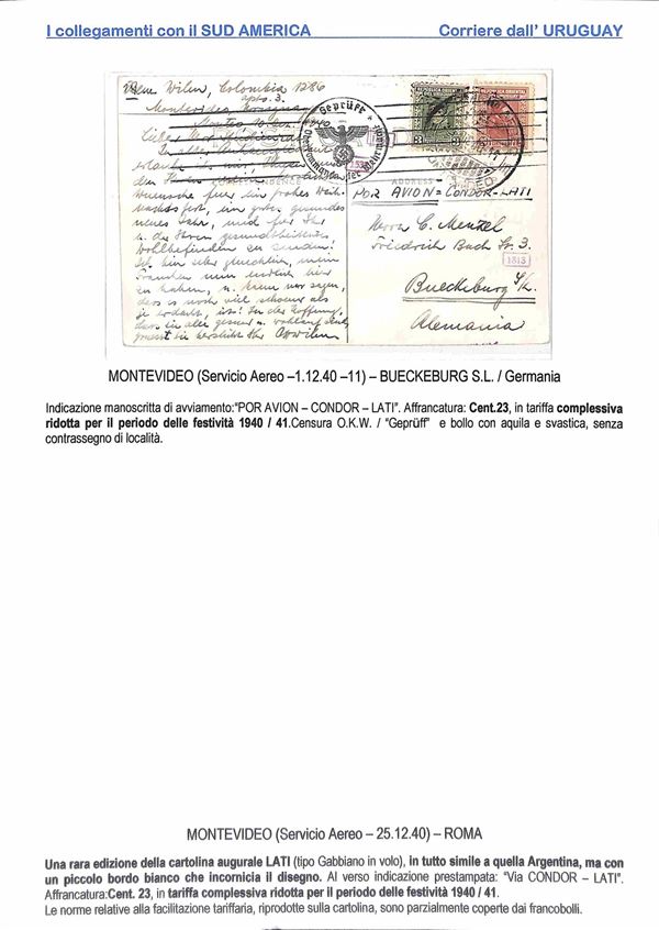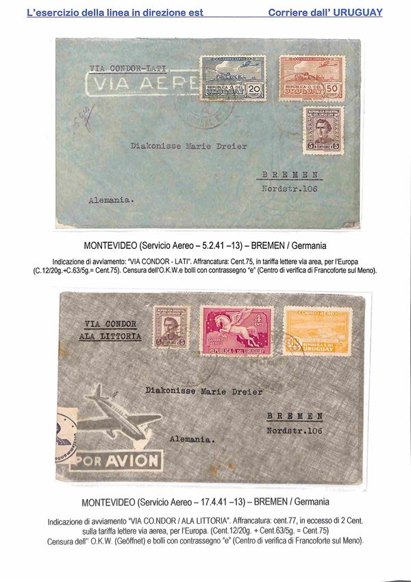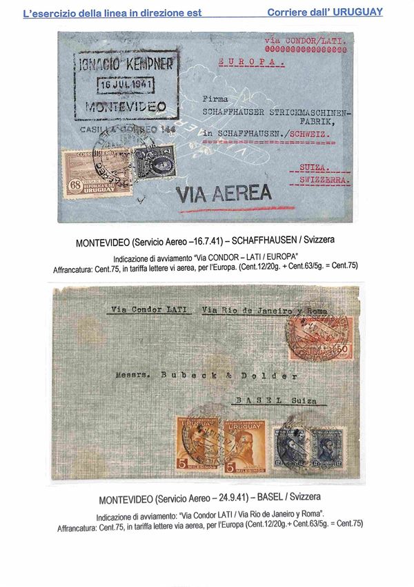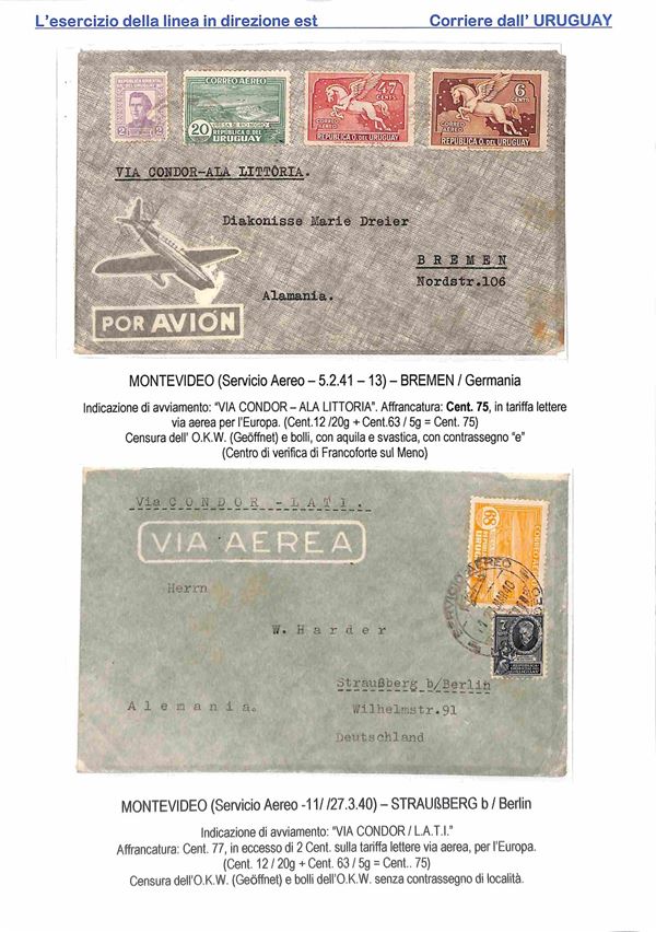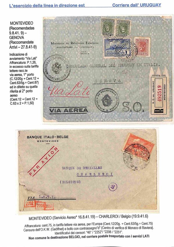 1940/1941 - Esercizio della linea L.A.T. con il Sud America - insieme di 9 aerogrammi dall'Uruguay - tutti da Montevideo con destinazioni Italia Germania Svizzera e Belgio - montati su 5 fogli A4 con didascalie