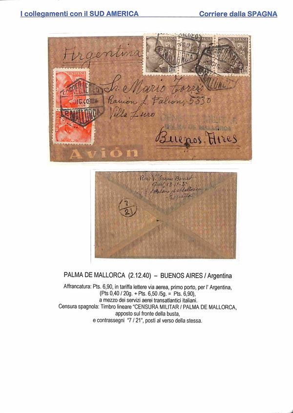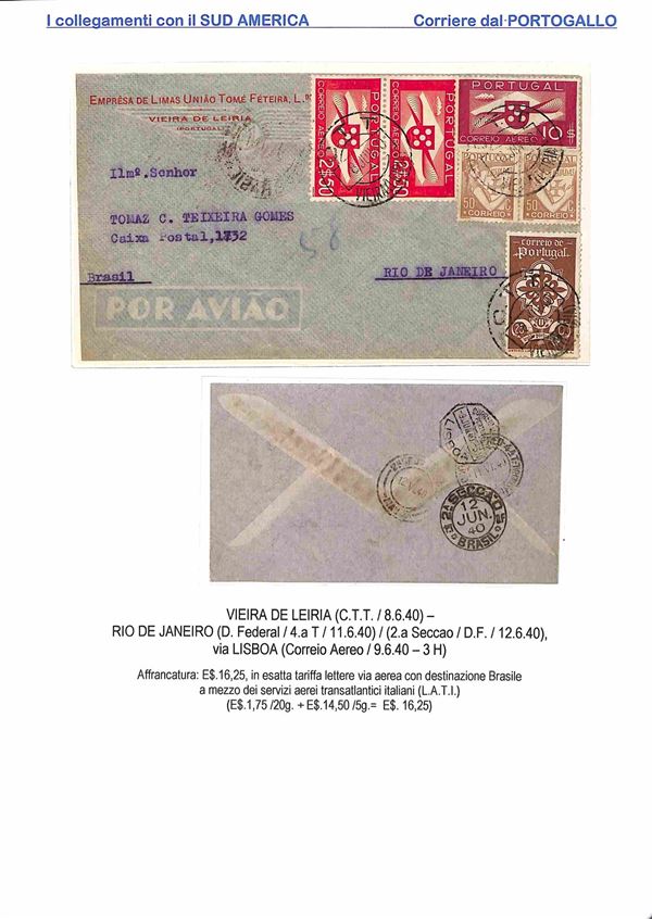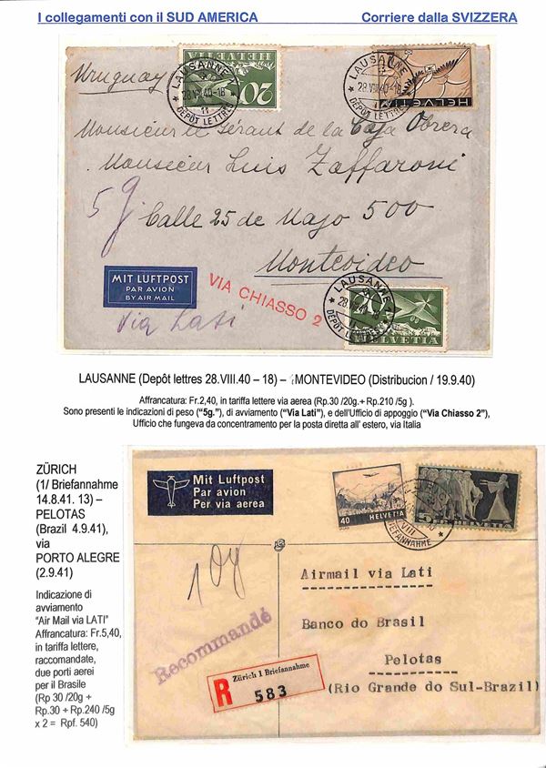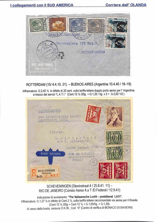 1940/1941 - Esercizio della linea L.A.T.I. con il Sud America - insieme di 6 aerogrammi da diversi paesi europei - 2 buste dall'Olanda 2 dalla Svizzera 1 dalla Spagna e 1 dal Portogallo con destinazione Argentina Brasile e Uruguay - montati su 4 fogli A4 con didascalie