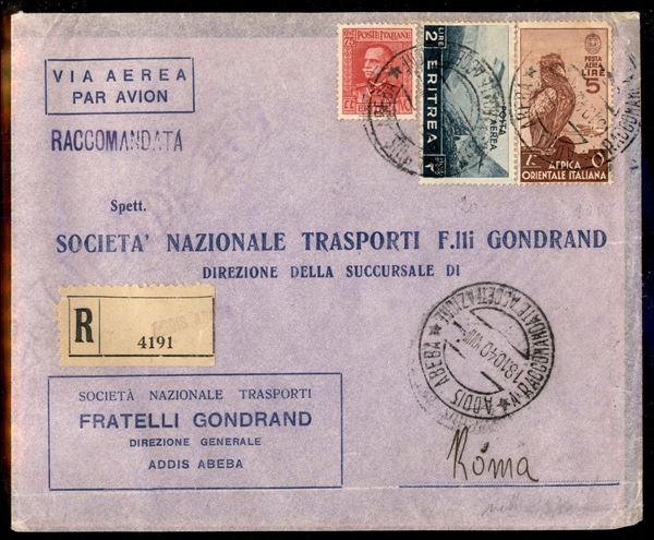 5 lire AOI Posta Aerea Soggetti Vari (9) + 2 lire Eritrea Posta Aerea Soggetti Africani (23 + complementare (200) su aerogramma raccomandato da Addis Abeba a Roma del 18.10.40