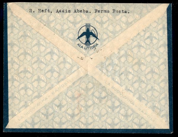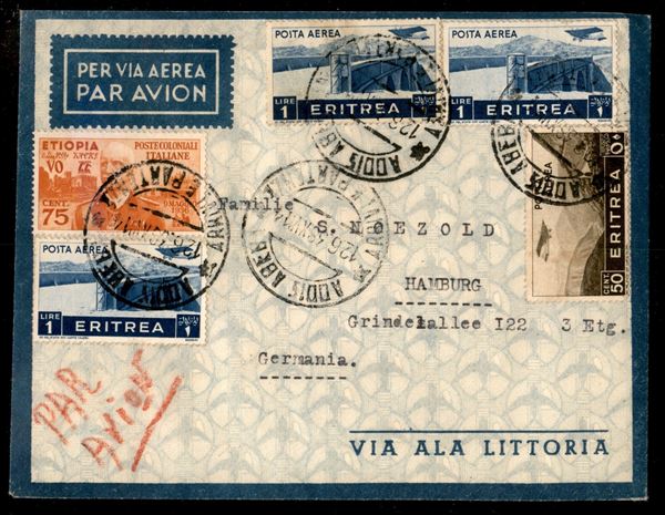 75 cent Vittorio Emanuele III (6) + complementari Eritrea Posta Aerea per 3,50 lire (18 + 21 tre) su aerogramma da Addis Abeba a Amburgo del 12.6.36