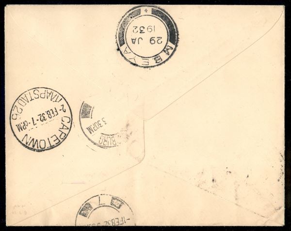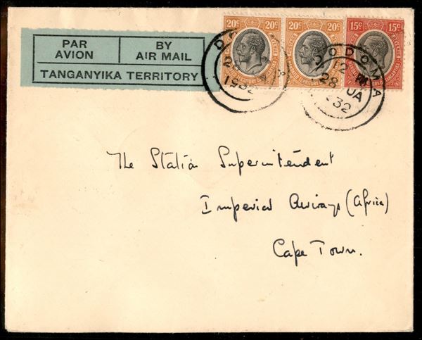 932 - Imperial Airways - Primo Volo regolare Londra Cape Town 20.1.32 - corriere dalla Tanzania - aerogramma da Dodoma del 28.1.32 per Cape Town - dispaccio composto da 20 lettere