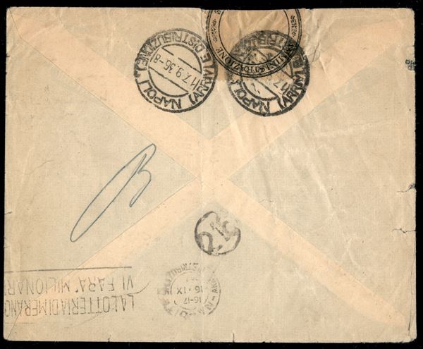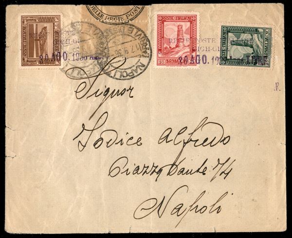 Aerogramma affrancato con tre valori della serie Pittorica (213 + 217 + 218) da Giggiga (annullo lineare su due righe P.ti 11 + datario) a Napoli del 17.9.36 - fascetta "Amministrazione delle Regie Poste" applicata a cavallo della busta - annullo non comune