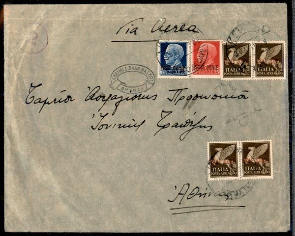 Aerogramma affrancato per 4 lire con 4 esemplari del 50 cent Posta Aerea + 75 cent e 1,25 lire ordinaria (7 + 8 + aerea 1) da Atene del 30,4,43 - Chiavarello + Raybaudi