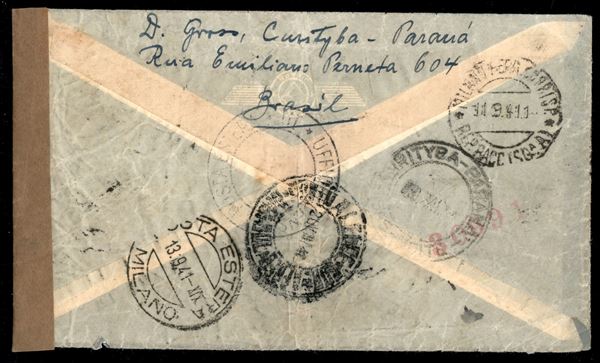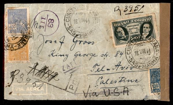 Aerogramma raccomandato via Lati da Curityba (Brasile) del 18.8.41 per Tel Aviv (Palestina) affrancata per 6900 rs - solo due lettere conosciute di questa linea da e per la Palestina - molto rara