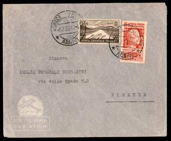 Africa Orientale - Aerogramma affrancato con 2,55 lire Soggetti Vari (16) + 20 cent (6) da Asmara a Firenze del 5.2.39 - pregevole affrancatura