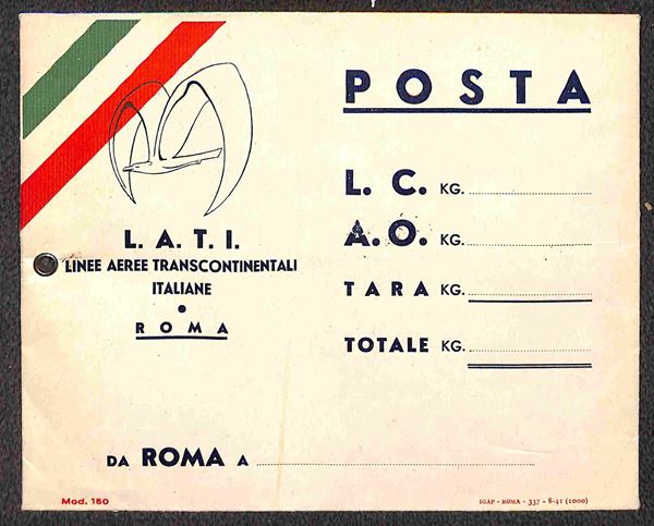 Busta ufficiale del servizio aereo L.A.T.I. - grande busta telata 181x145 mm (Longhi 3980) usata per accompagnamento dei pacchi postali inoltrati a Roma - reca sulla sinistra fascia tricolore e gabbiano in volo - nuova in perfette condizioni - molto bella e molto rara