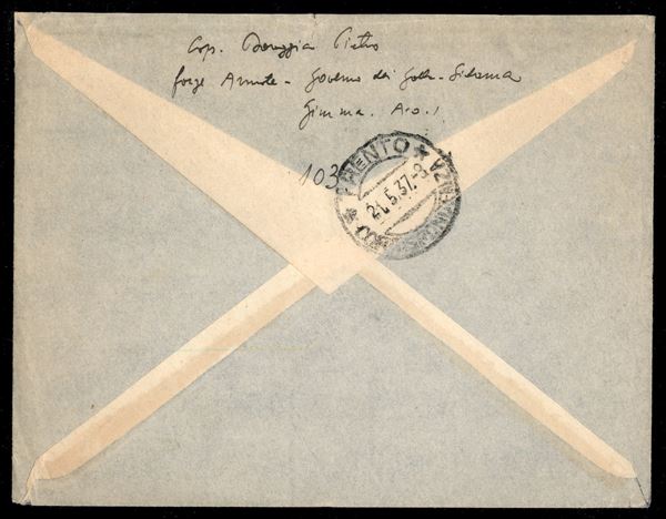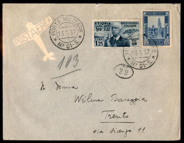 Campagna d'Etiopia - Posta Militare N. 01 S - aerogramma affrancato con valori gemelli da 1,25 lire (7 Etiopia + 223 Somalia) diretto a Trento del 15.3.37