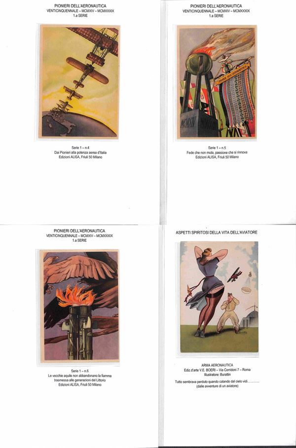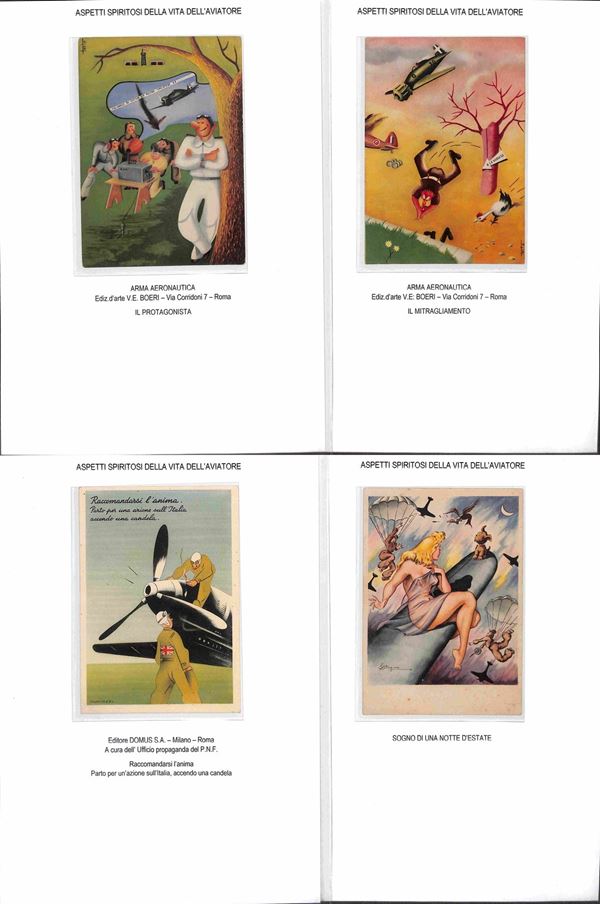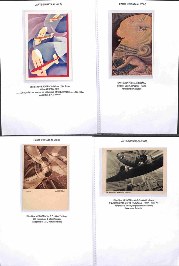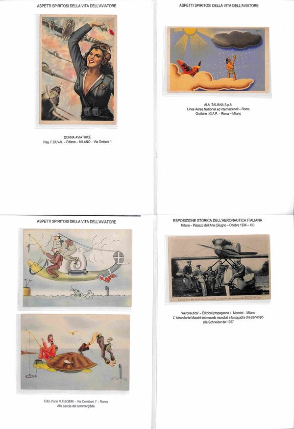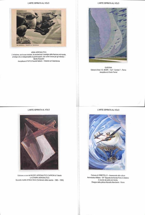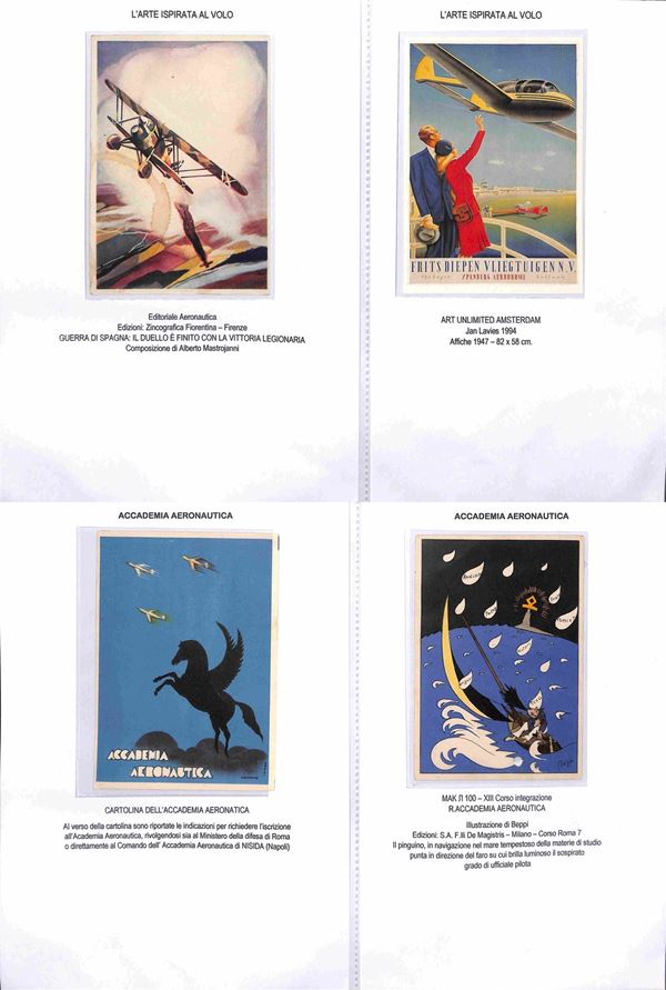 CARTOLINE - AVIAZIONE - 1920/1940 circa - Bellissima collezione di 62 cartoline tematica aeronautica montate su fogli A4 con didascalie - molte belle cartoline di illustratori e serie Pionieri Aeronautica - ottimo insieme