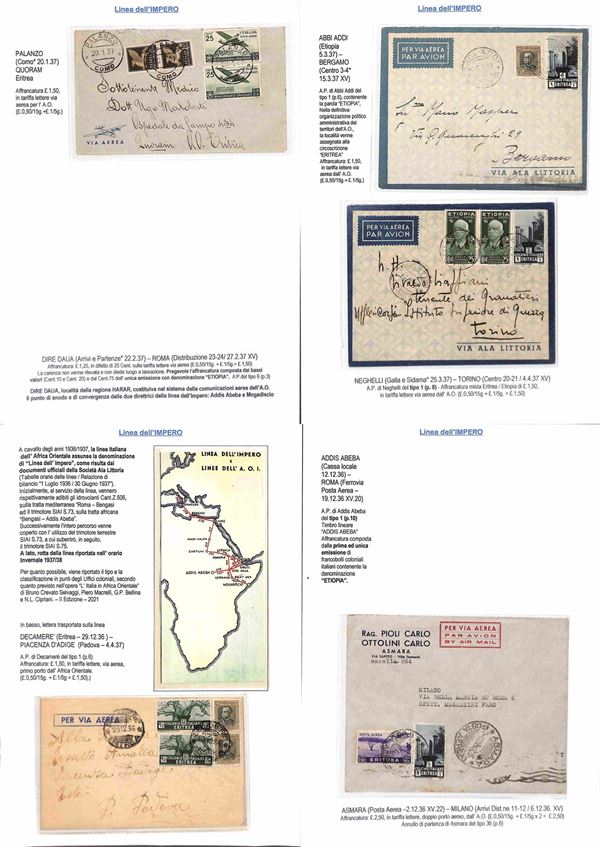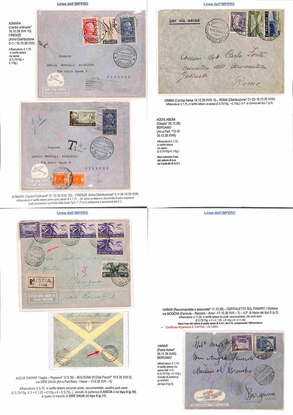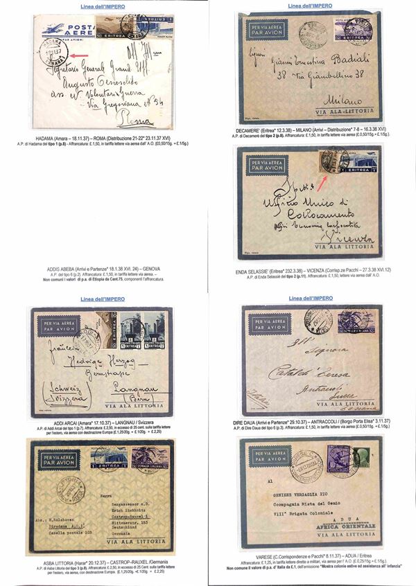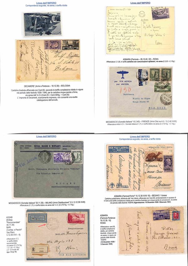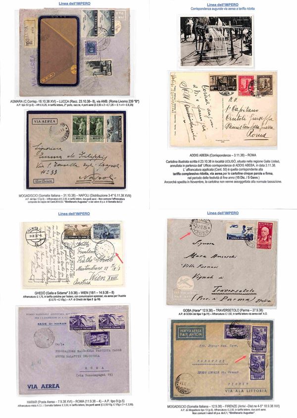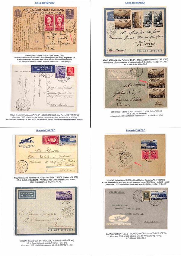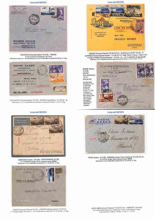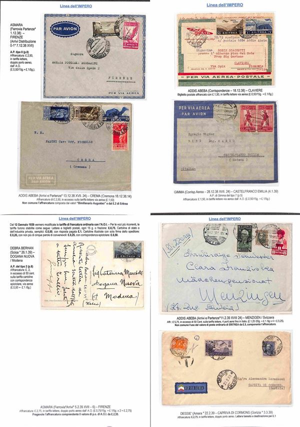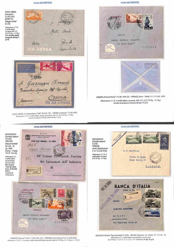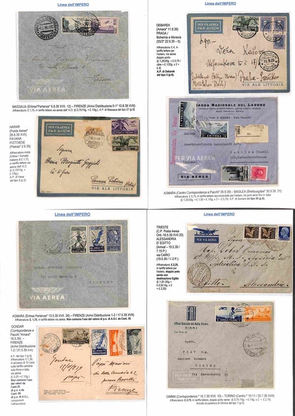 COLONIE - 1936/1940 - Collezione di 75 aerogrammi della linea dell'Impero tutti di diversi collegamenti con anche annulli rari montati su fogli con didascalie - insieme molto bello anche con pezzi interessanti per tariffa e destinazione