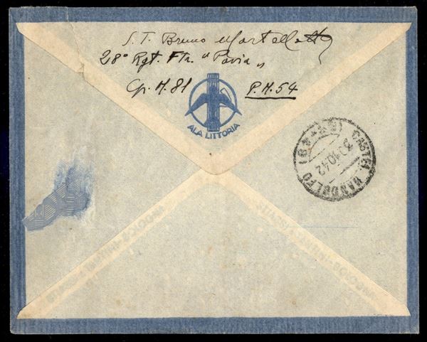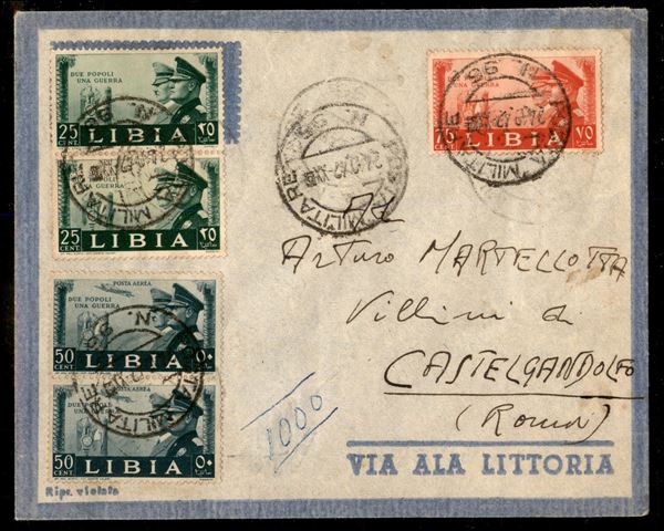 Coppia del 25 cent + coppia del 50 cent + 75 cent Fratellanza d'Armi (174/176) su aerogramma da Posta Militare N. 96 (El Daba) per Castelgandolfo del 24.10.42 - pregevole affrancatura su bella busta Ala Littoria