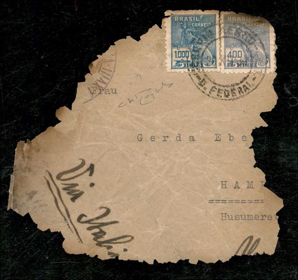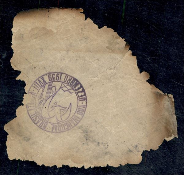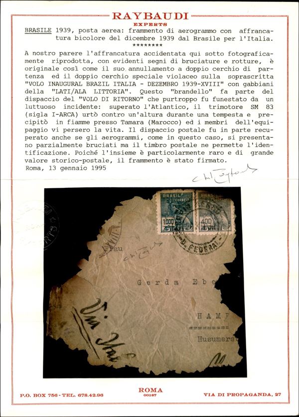 Crash flight - Rio de Janeiro Roma 20.12.39 (Longhi 3935) volo interrotto a Tamara (Marocco) - resto di busta del corriere per la Germania con al retro timbro violetto del volo - cert. Raybaudi