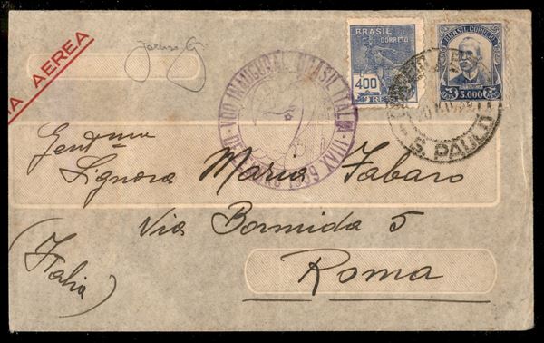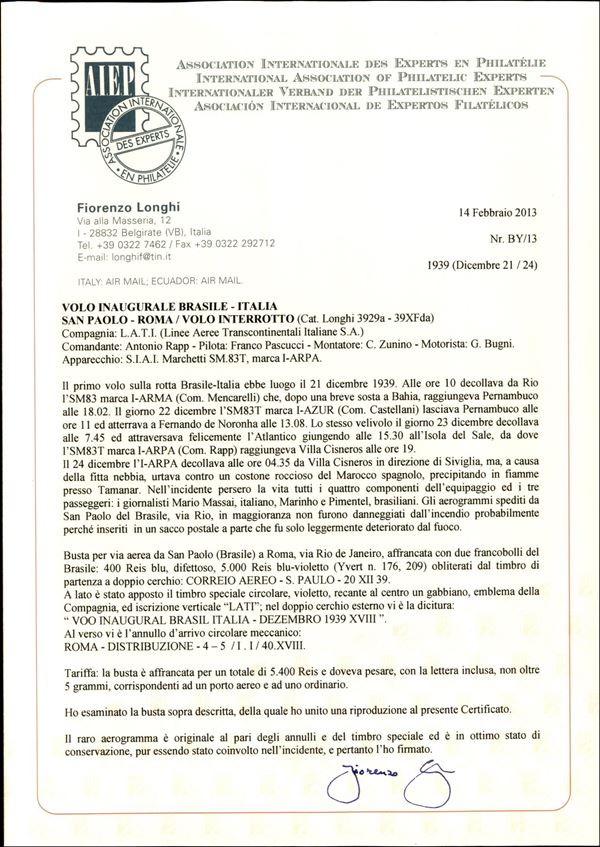 Crash flight - San Paolo Roma/Volo interrotto 20.12.39 (Longhi 3929a) - busta in ottime condizioni malgrado l'incidente subito - cert. Longhi