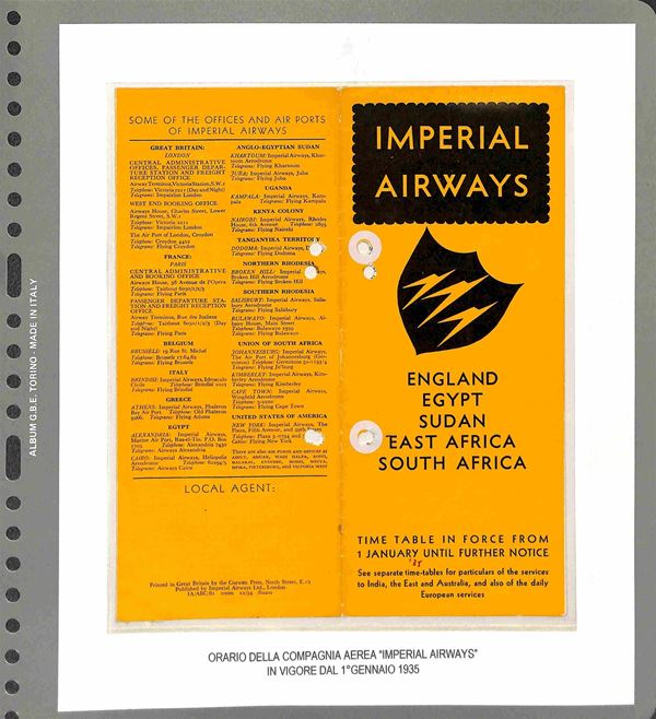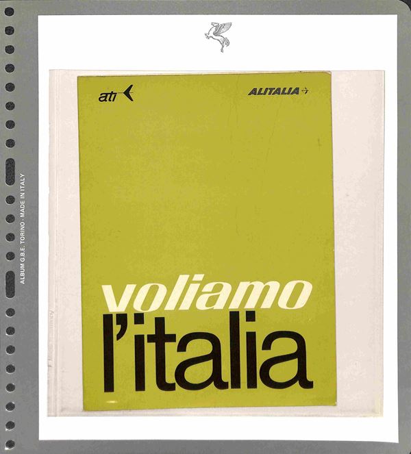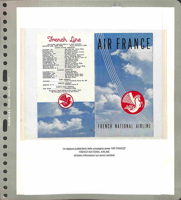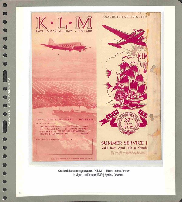 DOCUMENTI - 1923/1991 - Collezione di 14 documenti a carattere aviazione in album GBE - brochure degli orari di alcune compagnie aeree Iperial Airways Alitalia Klm Csa Air France pił altri documenti pubblicitari come Shell Unpa - da esaminare