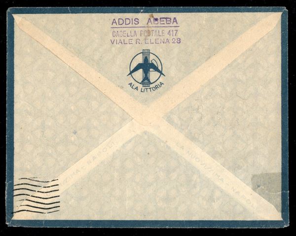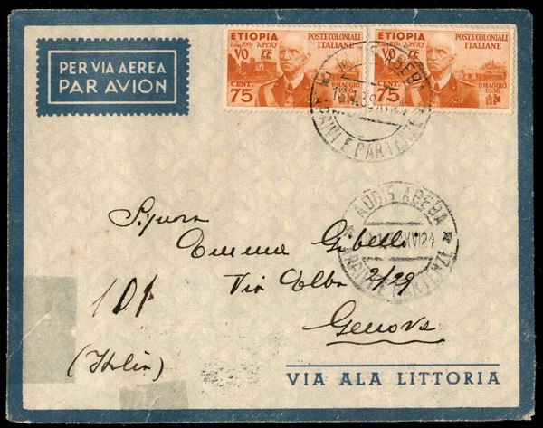 Due 75 cent Vittorio Emanuele III (6) su aerogramma da Addis Abeba a Genova del 18.1.39