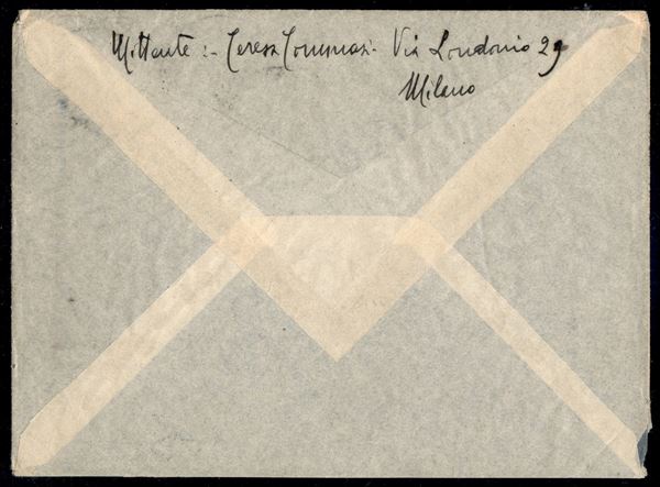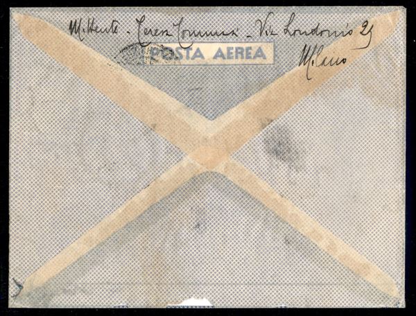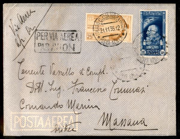 Due aerogrammi uno affrancato con striscia di tre del 60 cent Bellini P. Aerea (92) + complementari (384 + 386) da Milano a Massaua del 23.12.35 e uno affrancato con 25 cent Bellini P. Aerea (90) + 1.25 lire Salone Aeronautico (387) da Milano a Massaua del 21.11.35