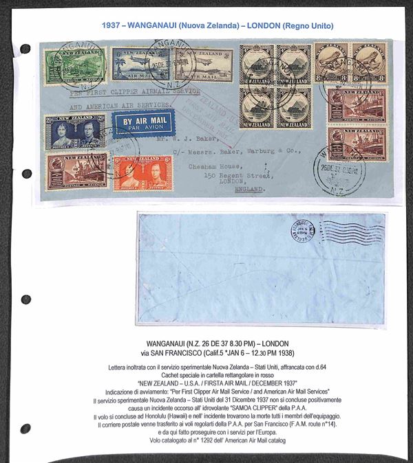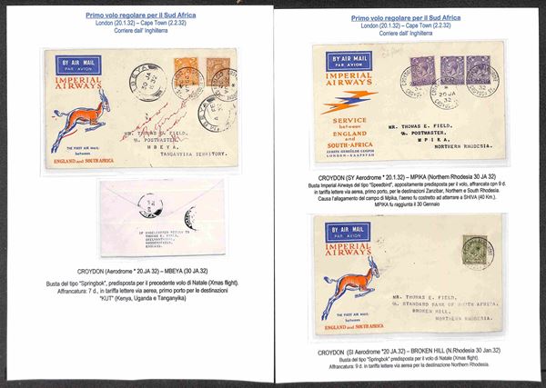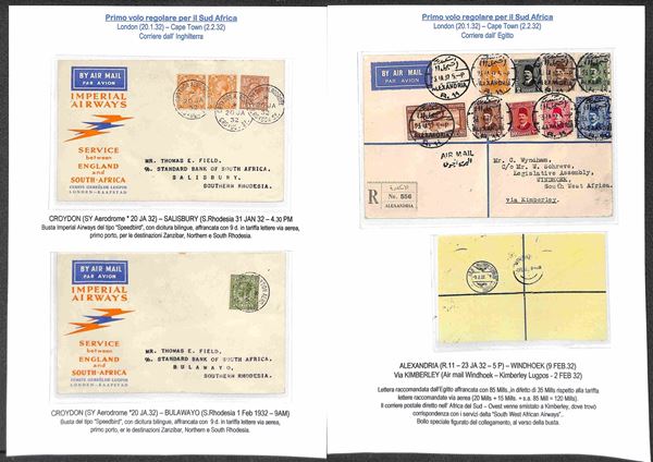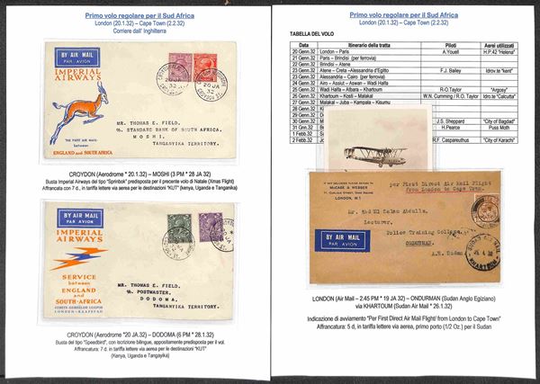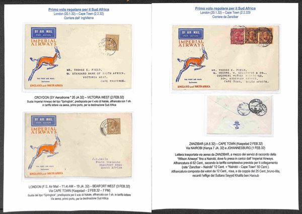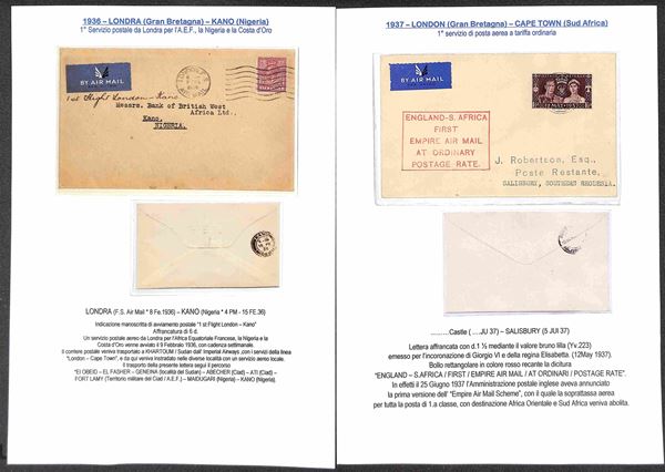 IMPERIAL AIRWAYS - 1932/1937 - Collezione di 24 aerogrammi pił 1 cartolina delle rotte Inghilterra Sud Africa e Australia - include buste dall'Inghilterra (x15) Egitto (x2) Zanzibar (x1) Sud Africa (x1) Tanzania (x1) Nuova Zelanda (x3) Tailandia (x1) - tutte montate su fogli A4 con didascalie - insieme molto bello