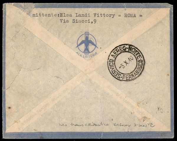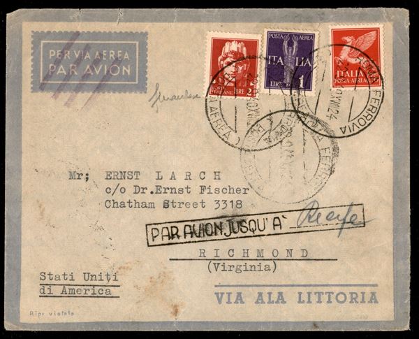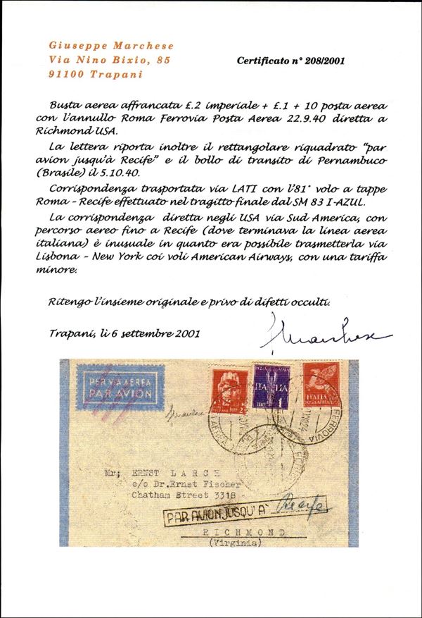 L.A.T.I. - Aerogramma affrancato per 13 lire (14/15 + 17) da Roma per Richmond del 22.9.40 - busta viaggiata via Sud America "Par Avion Jusqu'a Recife" per evitare la censura Britannica - cert. Marchese