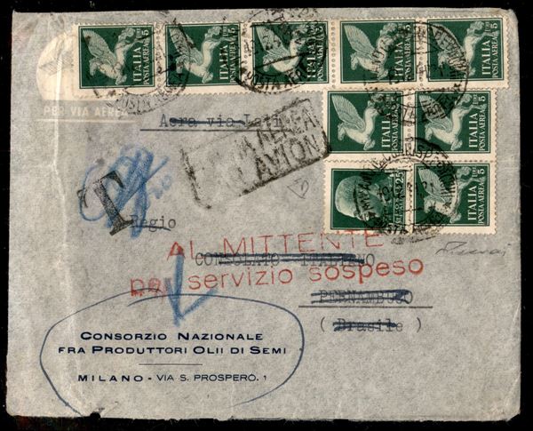 L.A.T.I. - Aerogramma affrancato per 35,25 lire con valori di Imperiale (otto 16 + 248) da Milano a Pernambuco del 19.12.41 - timbro in rosso "Al Mittente per servizio Sospeso" in quanto il collegamento fu chiuso quel giorno - Diena