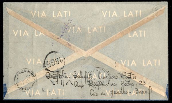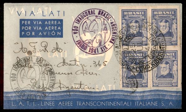 L.A.T.I. - volo inaugurale linea Brasile Argentina - aerogramma affrancato con 1600 reis da Rio de Janeiro del 25.7.41 a Buenos Aires - cachet in viola a ricordo del volo