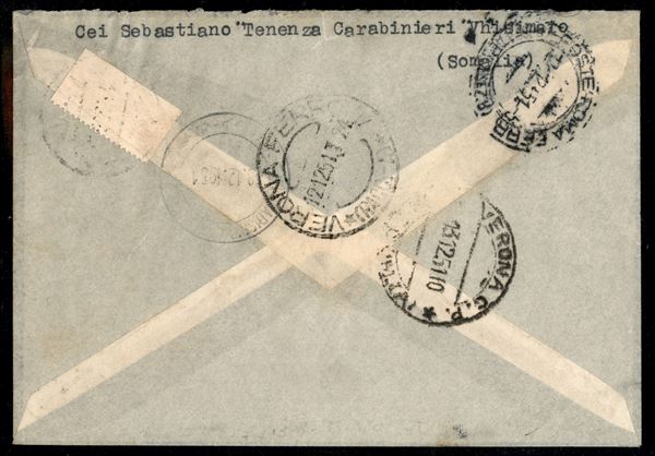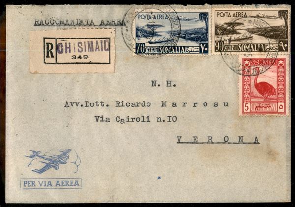 Posta Aerea 70 cent + 90 cent Aereo e Veduta (4 + 5) + 5 cent Soggetti Vari (2) su aerogramma raccomandato da Chisimaio (Mogadiscio) a Verona del 8.12.51